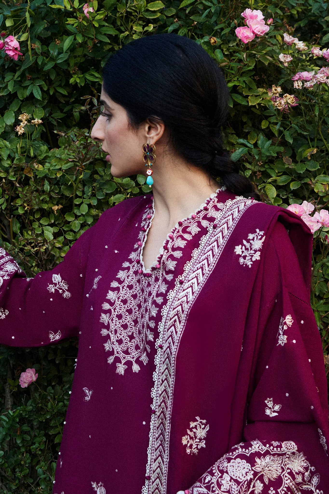 Afreen" unfolds like a winter dream, its lush magenta canvas adorned with ethereal ivory chintz embroidery that whispers of timeless elegance. This luxurious khaddar ensemble—a warm, textured shirt and trouser—wraps you in a cozy embrace, perfect for the season’s cooler days. Delicate floral vines, enchanting birds, and pomegranate motifs bloom like a vintage winter garden, evoking an otherworldly charm against the berry-hued fabric.