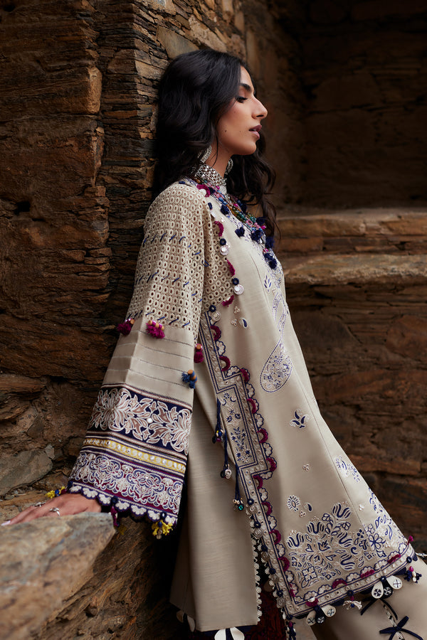 Introducing ‘Arsia’—a luxurious masterpiece that effortlessly blends bohemian artistry with the refined elegance of winter. The rich, warm beige canvas is elevated by the earthy sophistication of intricate tribal embroidery. Delicate motifs in ivory, frost blue, and florentine are meticulously crafted, telling a timeless story of craftsmanship that seamlessly merges the essence of winter with free-spirited allure.Paired with a contrasting printed silk dupatta, this ethereal ensemble strikes the perfect balance between modernity and tradition.