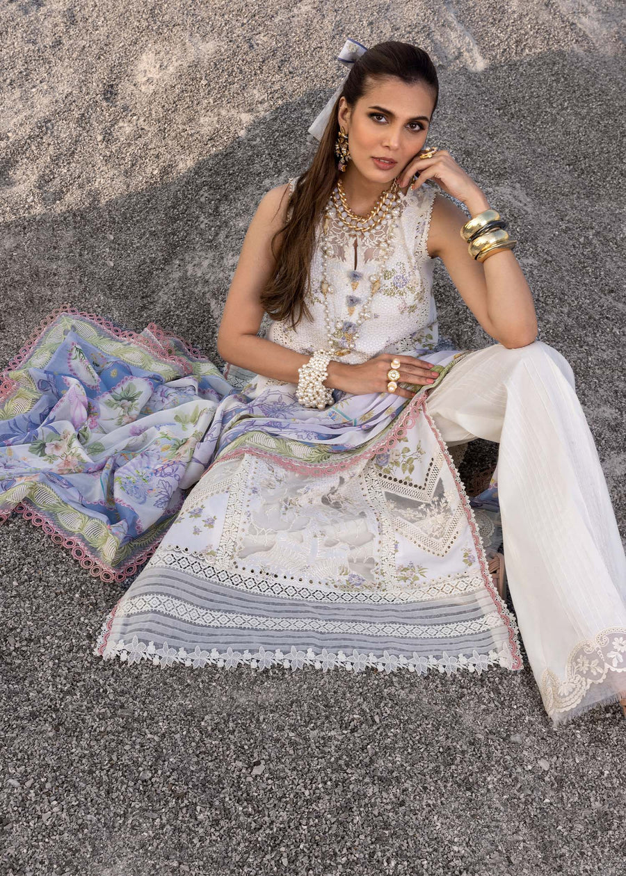 Additional Description: Porcelain dream with its celestial ivory canvas providing a sublime backdrop for a dreamy floral print in shades of lilac, sage and periwinkle. Delicate Ivory embroidery intricately running down the front in a geometric pattern ending with organza appliqué further enhances its sense of sophistication. The side panels are composed of gorgeous, miniature ghaara vines on organza and chicken holes bordering each panel.