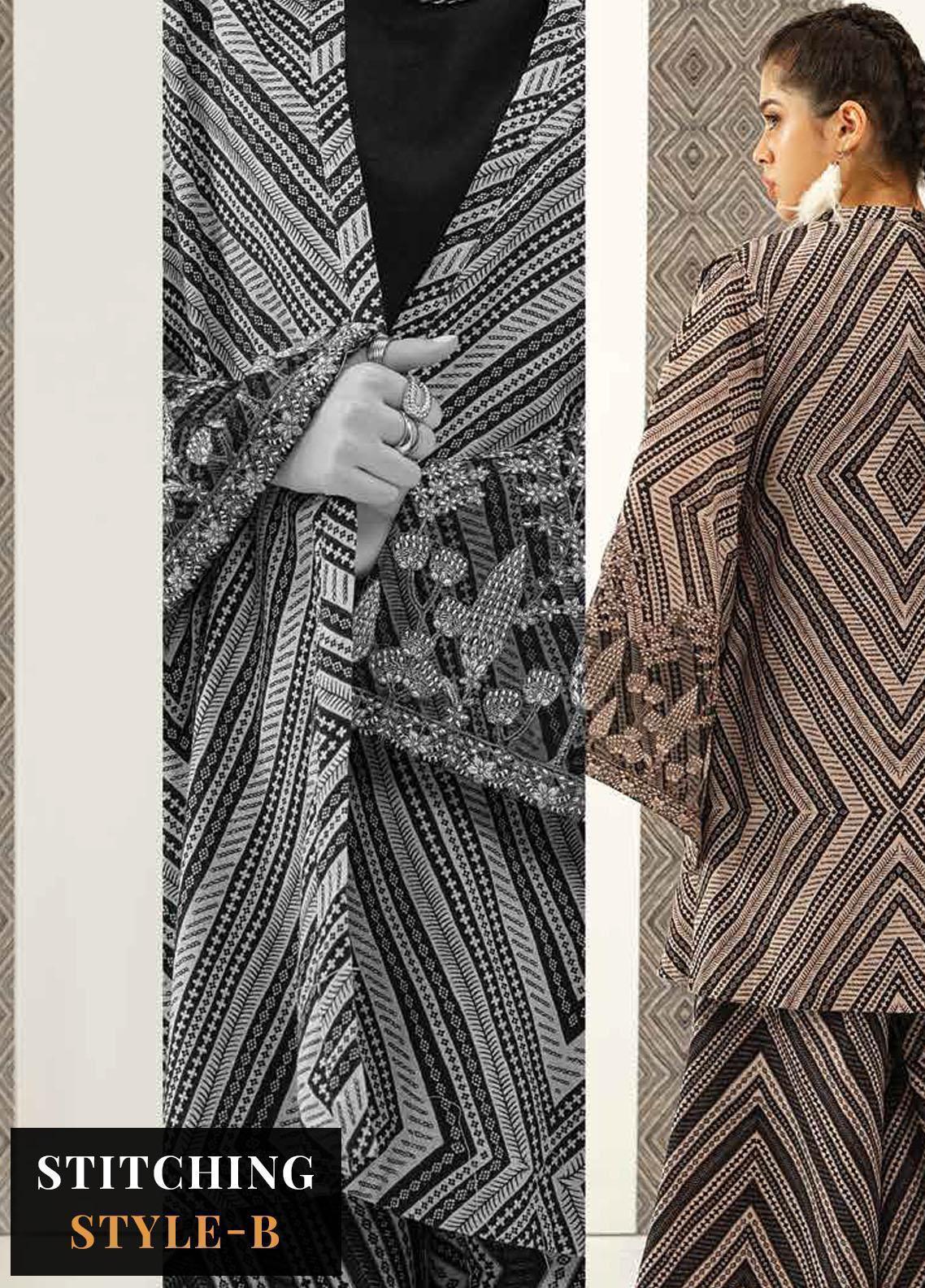 A mesmerizing composition is layered on this vibrant orange canvas. It features an efflorescent amalgamation of delicate blue and grey that accentuates the perfect Khaddar canvas. The exquisitely designed shirt is paired with a vividly adorned dupatta portraying a bold chevron print and ornamented with an embroidery patch. This playful feminine design perfectly encapsulates the spirit of winter and is one of the favourites in this collection.
