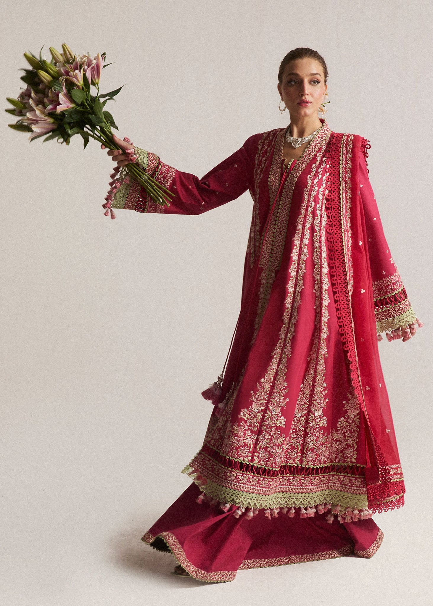 This resplendent floral intricate embroidery in their full bloom on a carrot pink panels based shirt. Full of florals in their own glory creating a perfect balance. Same chiffon embroidered dupatta merging with the flowers adds a balance to the complete look. This interplay of ivory and pinks creates a very light and easy to carry vibe with same base trouser.