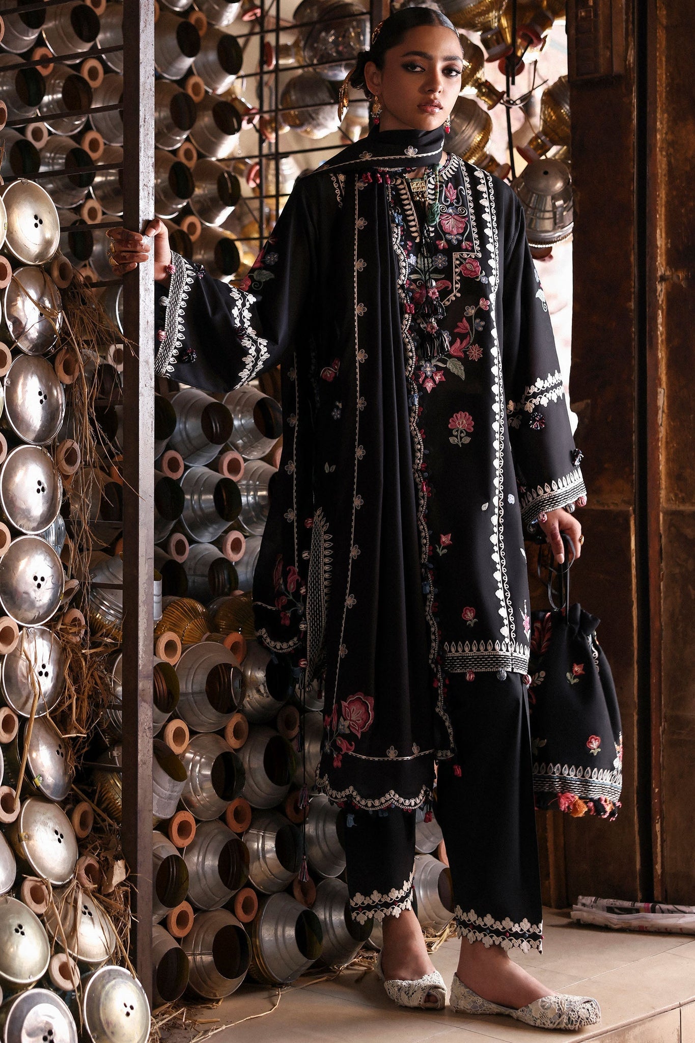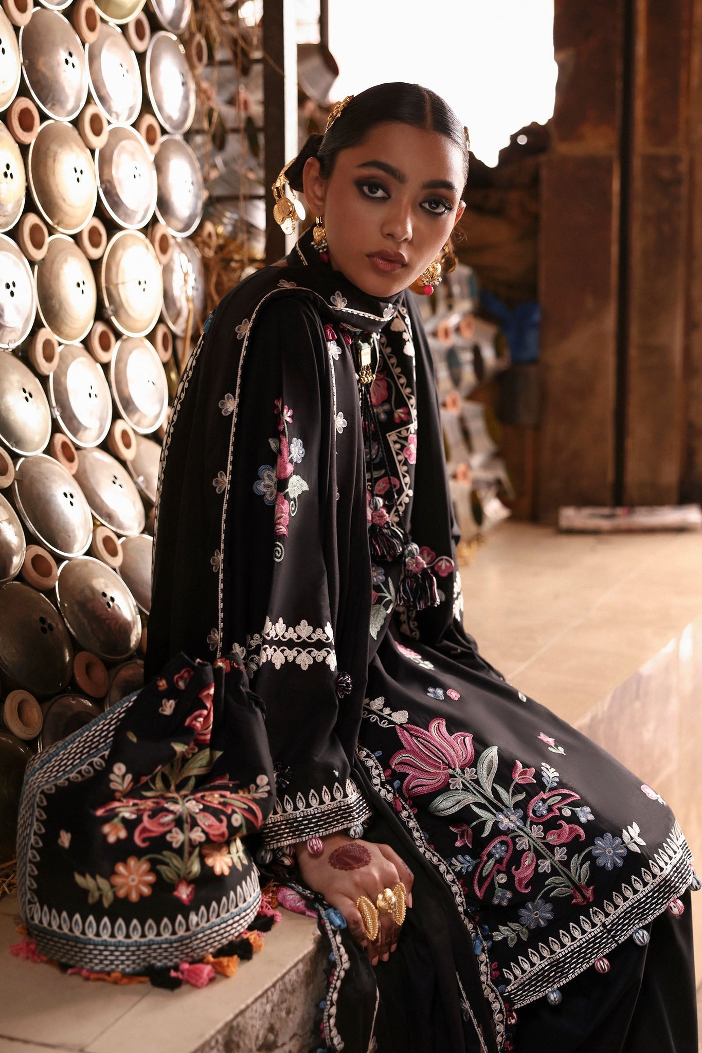 DESCRIPTION: Like a forgotten melody drifting through the winding alleys of Lahore, Zeenat captures the charm of days steeped in culture and quiet beauty. Rendered on a noir canvas, this ensemble is brought to life with boho-floral embroideries in hues of moss, lilac, raspberry pink, berry-blue, and antique ivory — reminiscent of the blooming courtyards behind intricately carved wooden doors.