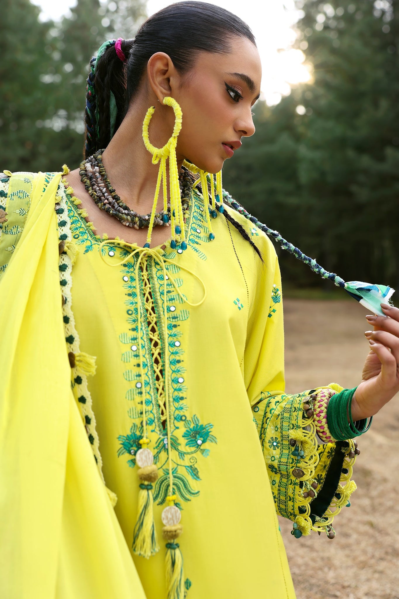 - DESCRIPTION: Elaya – Bold, fresh, and straight off the trend charts! Dipped in a high-fashion neon lime hue, this electrifying ensemble is all about making a statement. Intricate tribal-inspired embroideries in lush shades of sage and green add depth, while the tonal voile dupatta, edged with delicate embroidery and exquisitely detailed pallus, brings effortless elegance. Paired with the coolest printed trousers, Elaya is the ultimate blend of tradition and trend—made for the Zaha girl who turns heads with her fearless summer style.