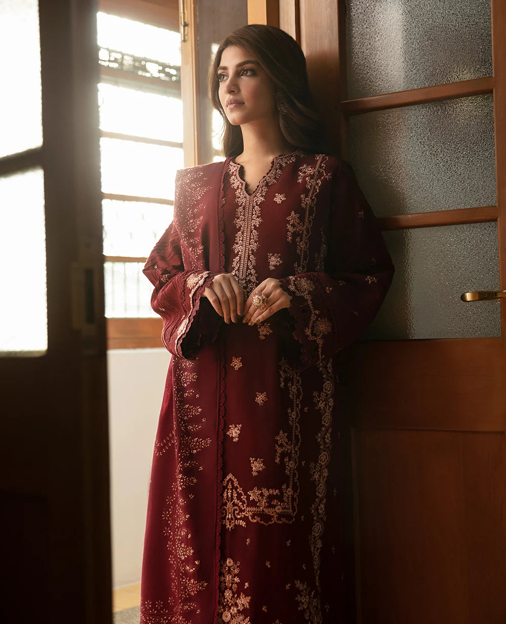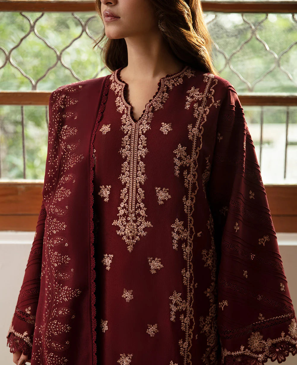 Embrace confidence and style with this elegant wine-colored shirt, designed with a chic three-panel structure and adorned with Kashmiri floral and ornamental embroideries in muted maroon tones. The intricate detailing adds a stunning touch, seamlessly merging modern flair with refined elegance. Complemented by a beautifully hand-stitched Kashmiri shawl in soft beiges and browns, this ensemble is a magnificent addition to any wardrobe. The exquisite embroidery and captivating design make it a versatile choice for various occasions. Celebrate your fashion sense and enjoy the timeless beauty of this exquisite creation.
