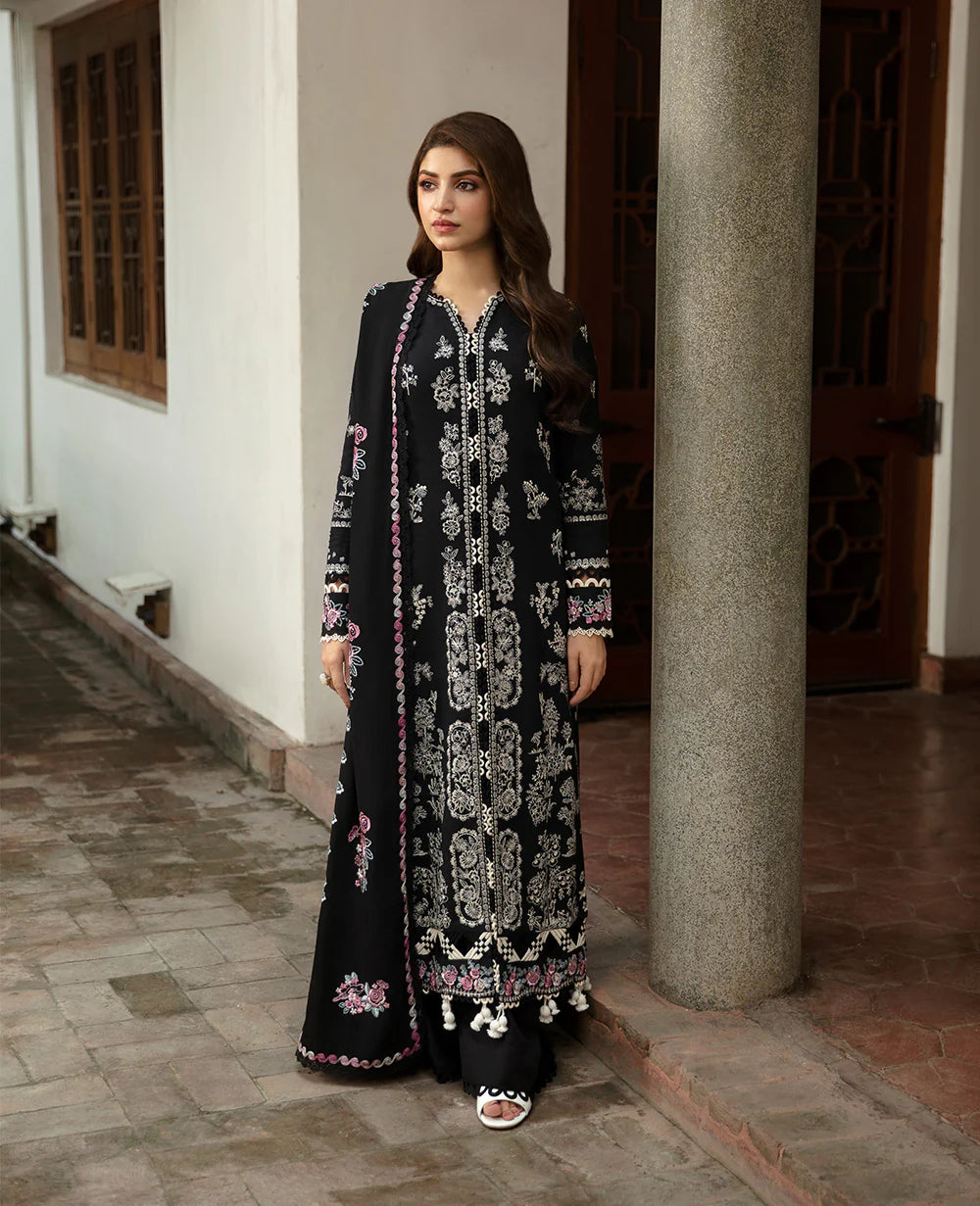 Make an unforgettable statement this winter with this captivating black-and-white ensemble. The black karandi fabric serves as the perfect canvas for meticulously crafted floral embroideries in shades of black and white, delicately accented with hints of Laguna, azure, and soft cream. Thoughtfully tailored for both elegance and comfort, the look is complemented by a sumptuous Acrylic shawl, richly adorned with blooming floral motifs and intricate patterns that add depth and texture.