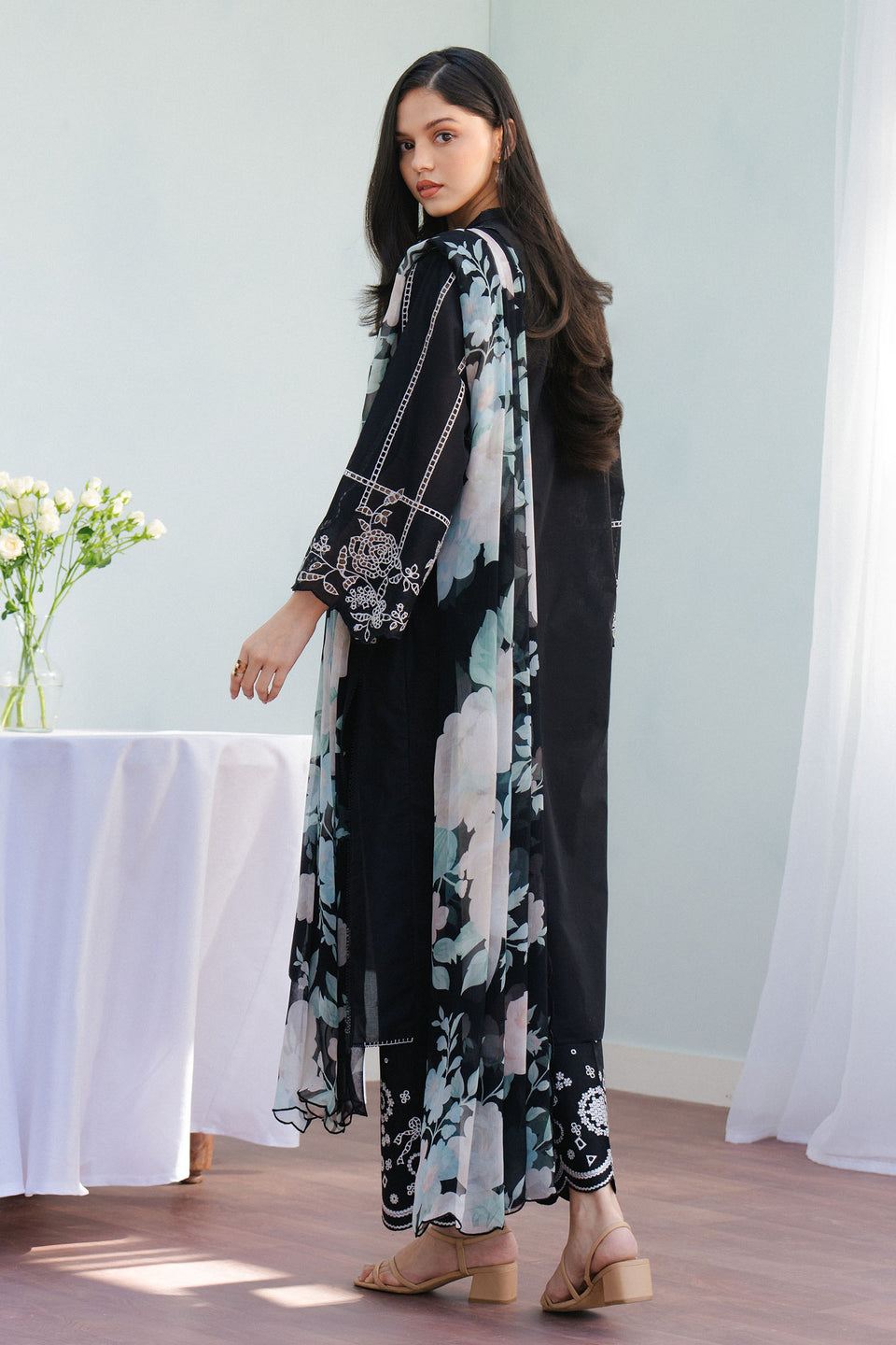 A commanding black silhouette with white floral accents on the shirt, paired with embroidered trousers—elegant, bold, and visually stunning.
