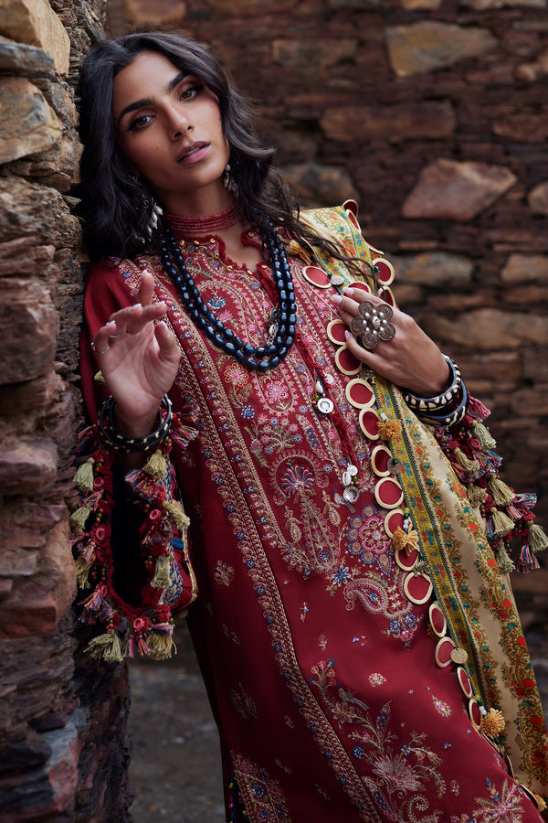 Paired with a luxurious ivory-beige silk dupatta, delicately detailed with a printed motif border, Elnaz becomes a masterpiece that transcends mere fashion. It is a visual symphony of warmth and sophistication, capturing the essence of winter’s elegance and a deep connection to heritage. This stunning creation is not just an outfit but a refined work of art, destined to be the crown jewel of any curated wardrobe.