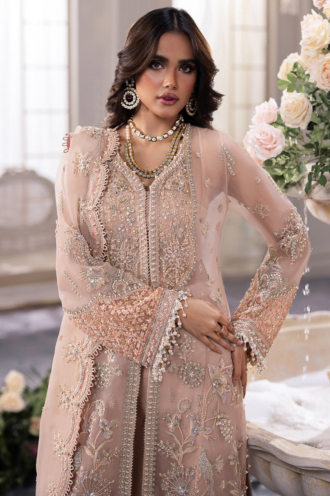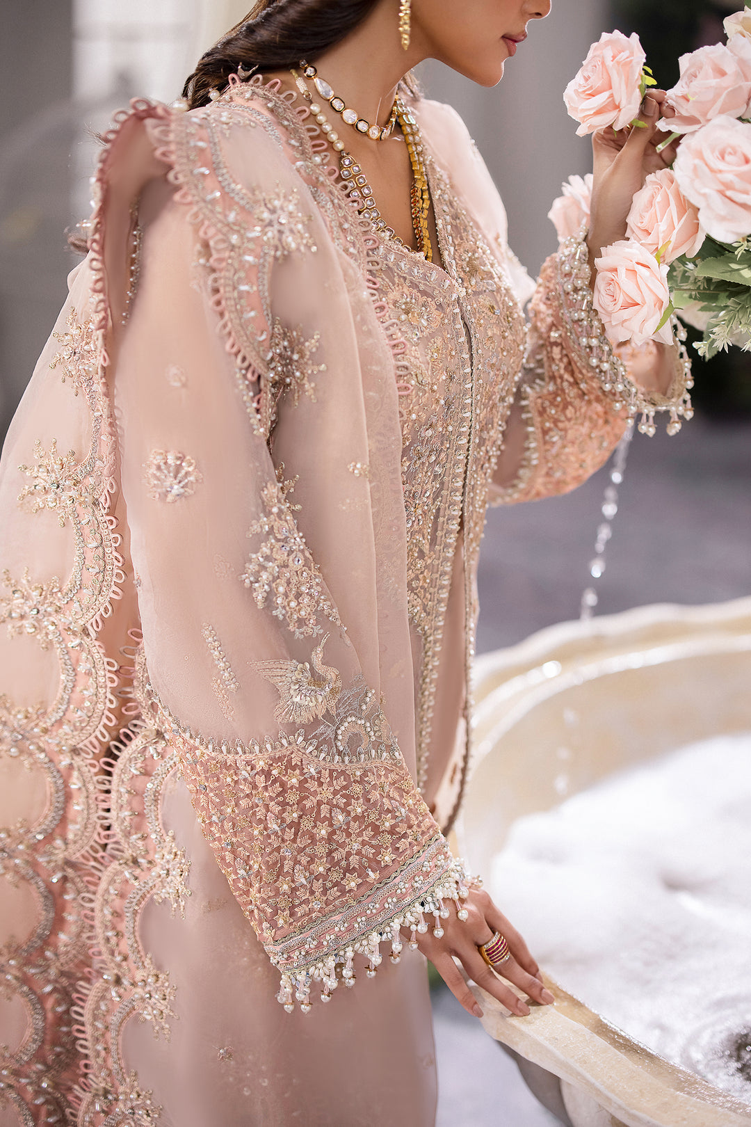 Drenched in the tranquil elegance of pastel tea pink hues, 'Elysia' manifests as a vision of ethereal beauty. Its delicate tulle canvas is adorned with glistening tilla embroidery and intricately woven threads in shades of sage, ivory, and periwinkle, complemented by lustrous pearls and sequin accents, with delightful touches of silver and gold. Harmoniously paired with tonal trousers and a resplendent dupatta, adorned with a meticulously embroidered border, this design exudes feminine charm and playful allure, making it the perfect choice for sophisticated daytime celebrations.