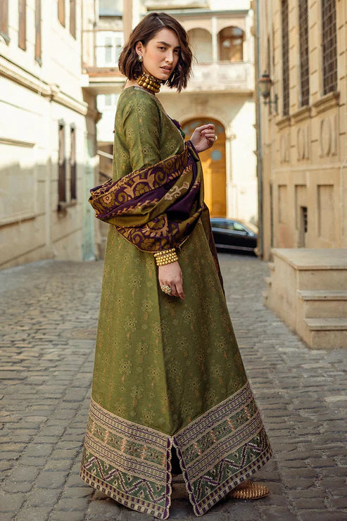 Gentle Touch“ showcases luxurious jacquard viscose fabric with intricate embroidered details, offering a perfect blend of elegance and comfort. Complete with a matching viscose jacquard shawl and adorned with handmade wool thread tassels, this ensemble radiates sophistication and artisanal charm.