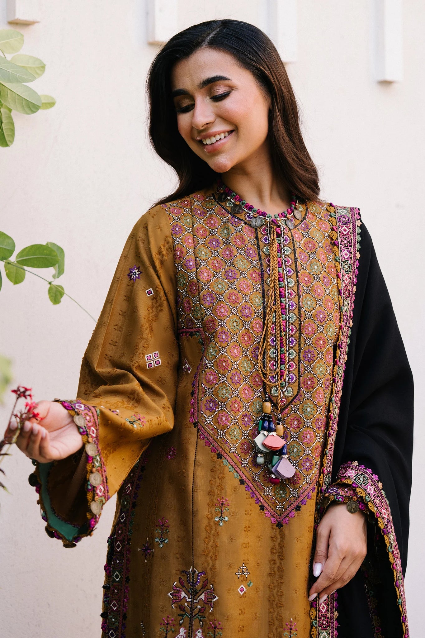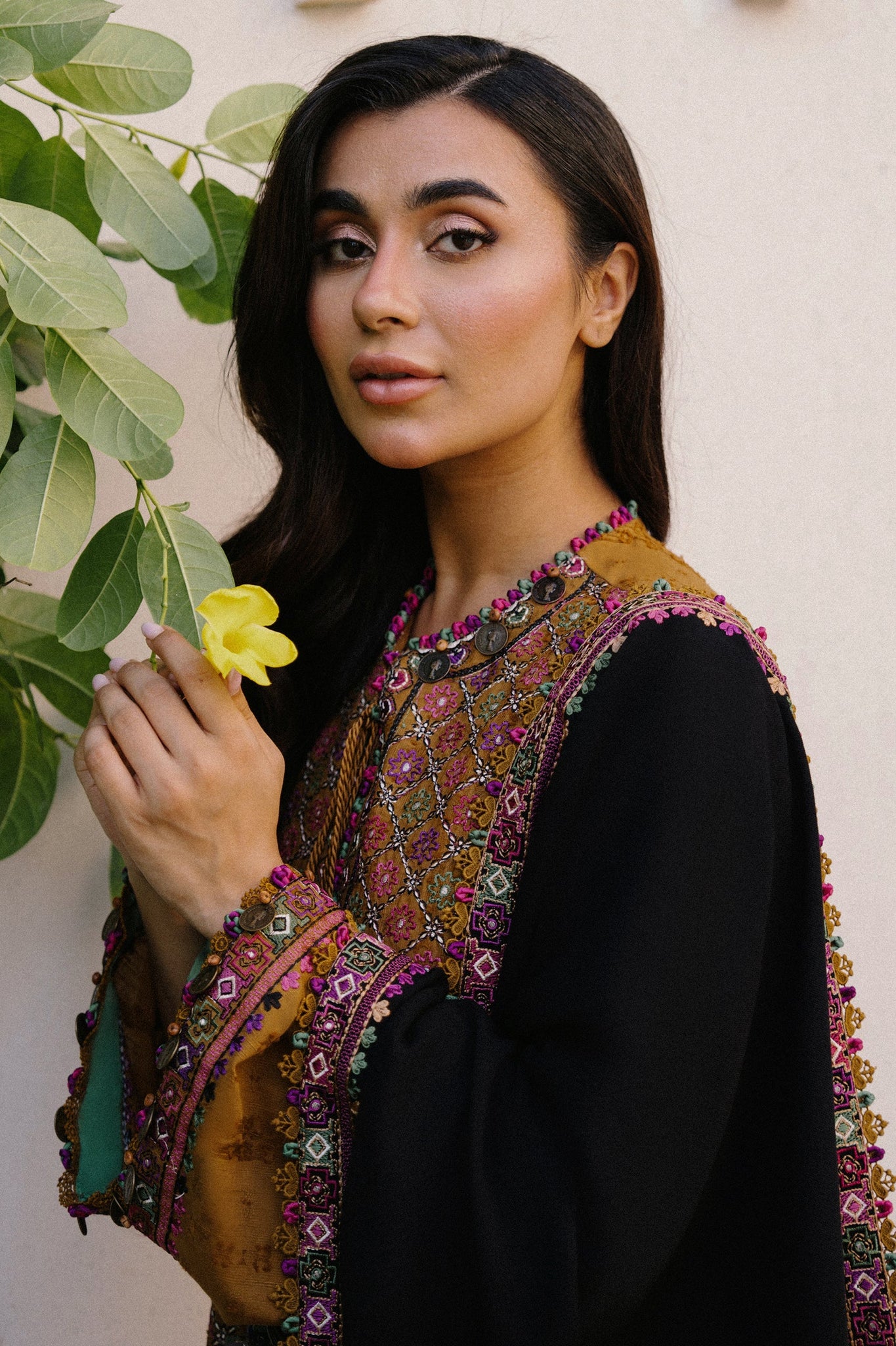 Paired with a luxuriously embroidered ebony shawl, its intricate motifs offer a delicate contrast, enhancing the cozy, comforting embrace of the ensemble. As winter wraps the world in its frosty touch, Gulzaar brings warmth and elegance, evoking the soft, glowing light of a fireside gathering. It’s the ideal blend of comfort and style, designed to make every winter moment feel magical, cozy, and effortlessly graceful.