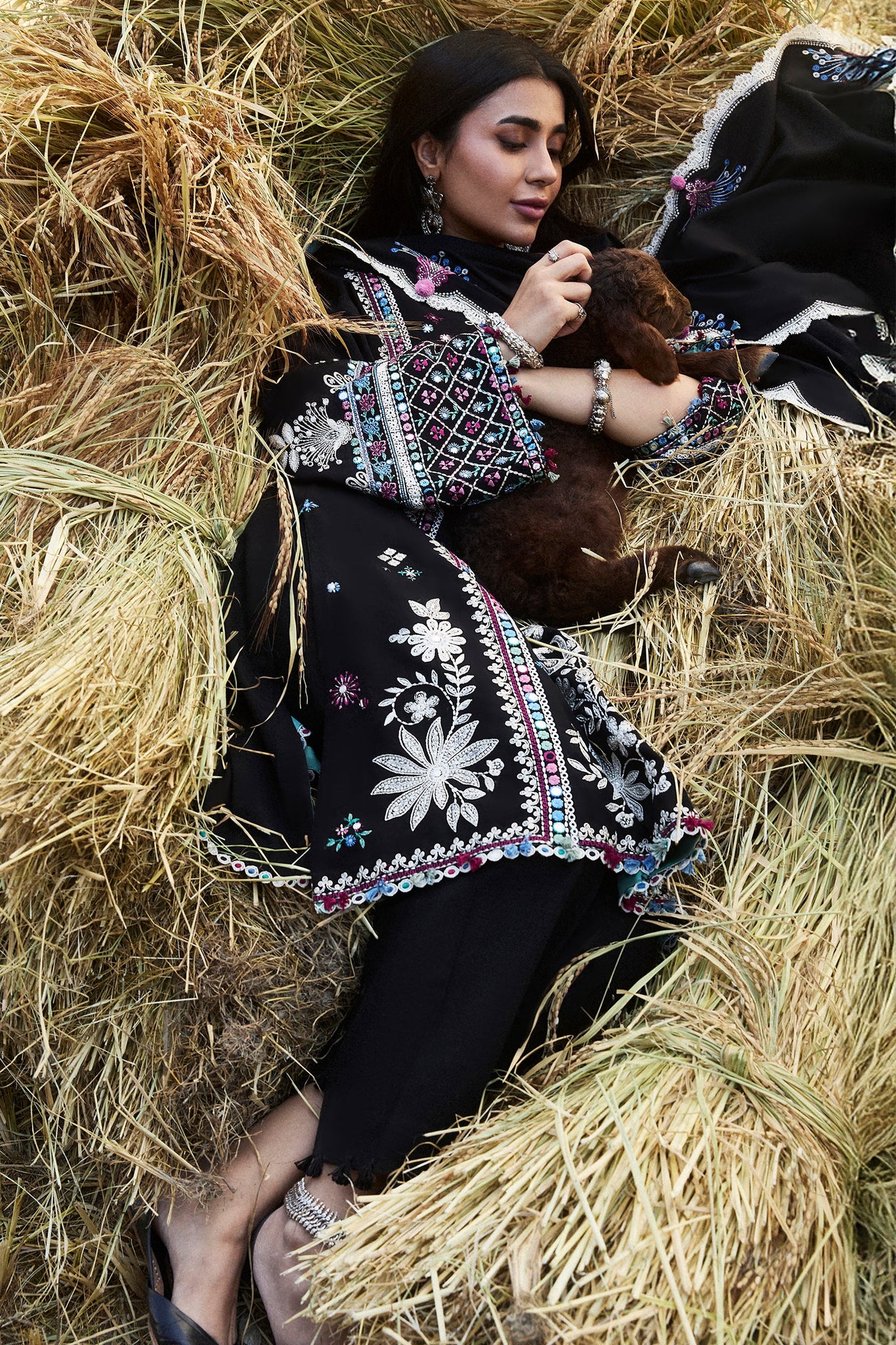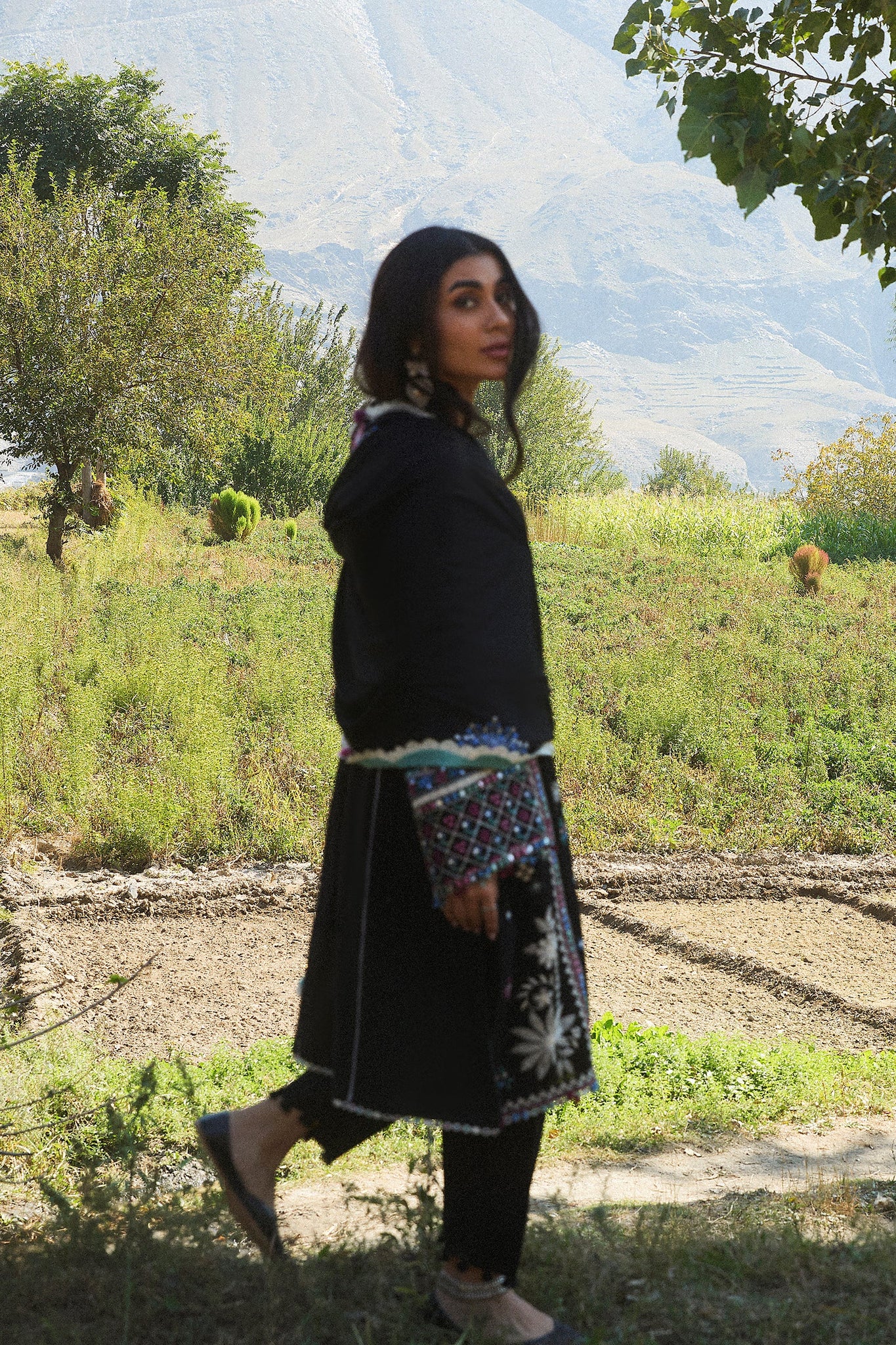 Hazan’ is a winter’s day captured in an ethereal embrace, where the smoldering ebony hue meets the gentle caress of winter sunlight. The intricate florals, embroidered with ivory, rich plum, azure, moss, and sage, shimmer as the sun’s rays filter through, casting a soft, golden glow across the design. Each stitch of marori tribal embroidery and delicate pani work tells a story of heritage, unfolding like the first light of dawn on a crisp winter morning. The sunlight dances across the fabric, highlighting the detailed patterns with a soft, dreamy glow that feels like a winter fairy tale. The beautiful embroidered sleeves, delicately adorned with the intricate ethnic motifs, add a refined touch of artistry, as if the fabric itself tells a story. Complemented by a tonal karandi shawl, its borders embroidered to perfection, Hazan radiates an otherworldly charm—elegant, serene, and beautifully grounded in the magic of winter’s light.