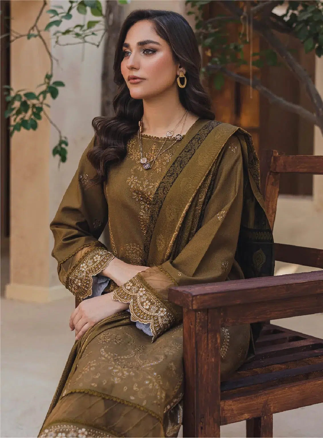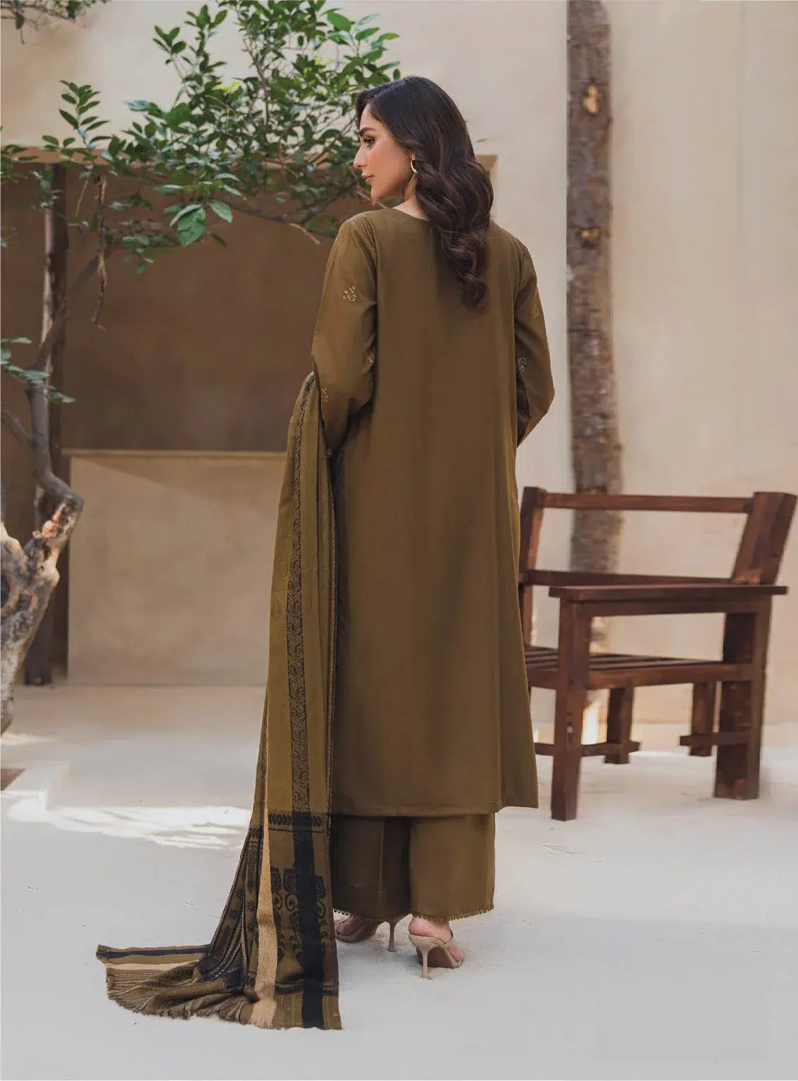 Introducing “Mahrosh by Panache Vol 4 MP-05” in Pickled Bean, a sophisticated addition to the new 2024 winter collection. This 3-piece unstitched set features a premium embroidered dhanak shirt with detailed embroidery on the back and sleeves, showcasing elegant craftsmanship. Paired with a luxurious jacquard wool shawl for added warmth and a plain trouser for a refined finish, this ensemble is ideal for winter festivities and everyday elegance. The rich tones and intricate designs bring together tradition and modern style, making it a standout choice for the season.