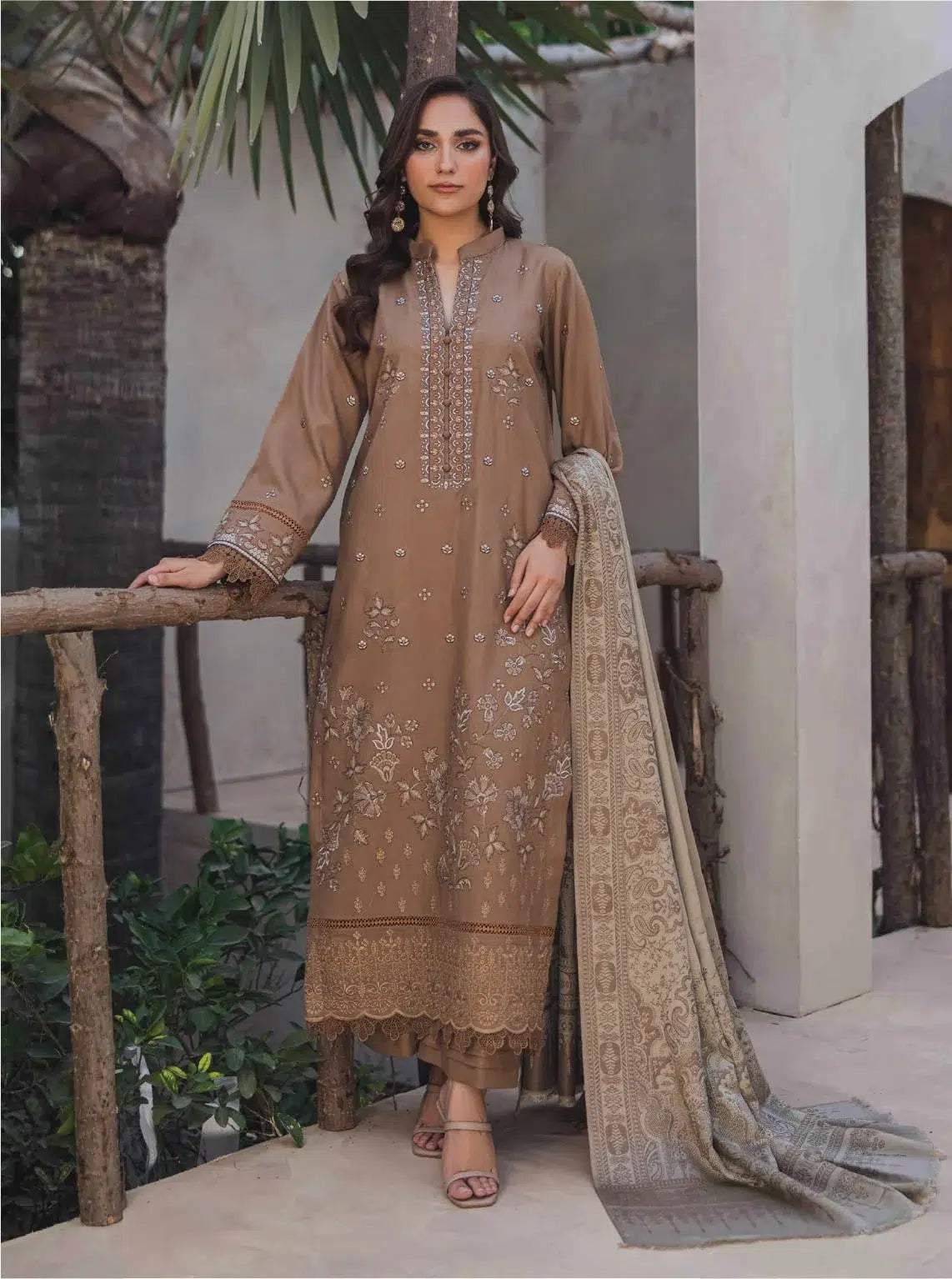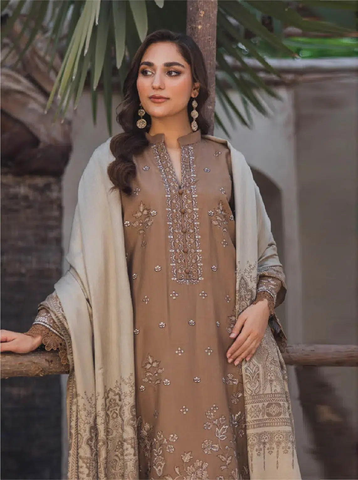 The 2024 “Mahrosh by Panache Vol 4 MP-10” collection introduces MP-10 in a classic brownish shade, ideal for winter. This luxurious 3-piece unstitched set includes a premium embroidered dhanak shirt with detailed embroidery on the back and sleeves, adding sophistication to your look. Paired with a warm jacquard wool shawl and plain trousers, it offers both comfort and elegance. This versatile ensemble, rich in design and crafted for the season, ensures you stay stylish and cozy, embodying the timeless charm of the Mahrosh collection. Perfect for making a refined statement at any winter gathering.