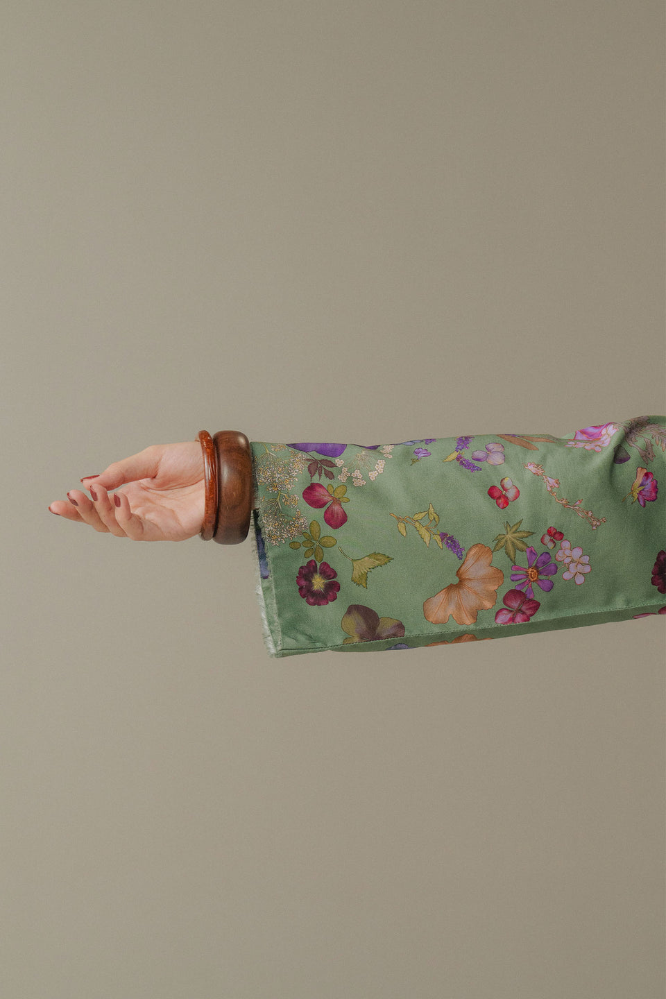 A hedge green shirt inspired by botanical motifs, paired with matching hedge green trousers featuring soft floral patterns. The ensemble is elevated with a deep purple shawl adorned with a blend of stripes and florals, adding a striking contrast and a touch of artistic sophistication to the look.