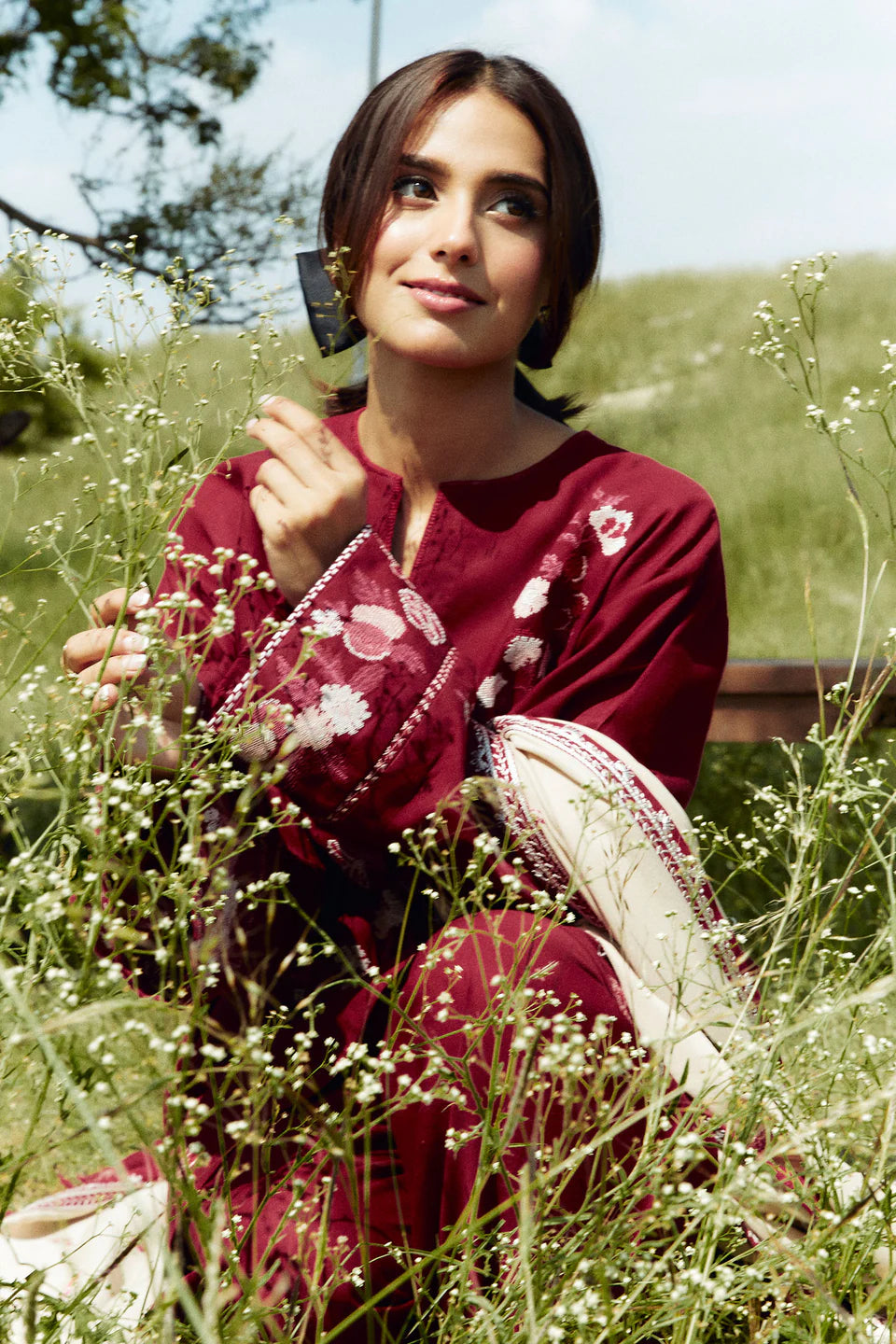 This red shirt is the perfect pop of color for fall. It pairs beautifully with a solid shalwar and an embroidered shawl.