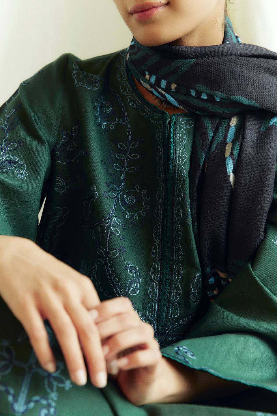 This dark green embroidered shirt, is paired beautifully with a solid shalwar and a printed shawl.