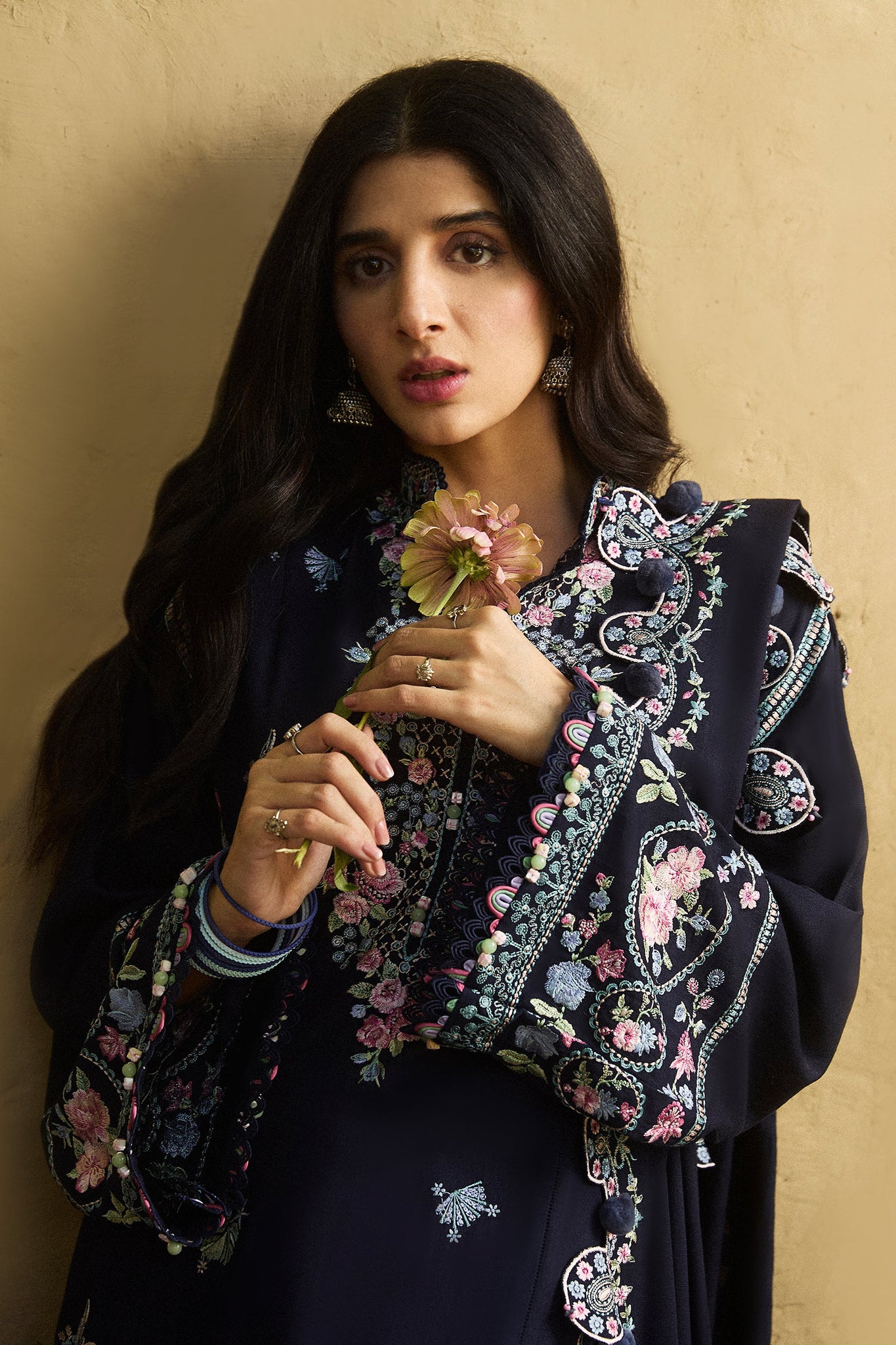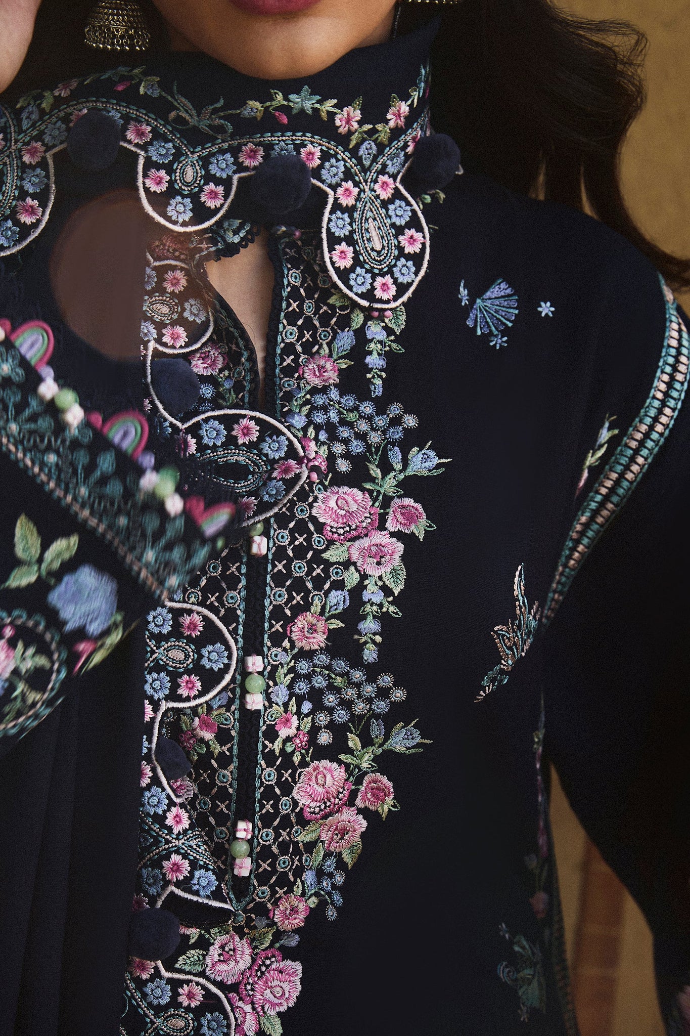 Enveloped in a deep, velvety navy, Raqs embodies the enchantment of winter’s quiet elegance, adorned with intricate embroideries inspired by Victorian artistry. The ensemble unfolds like a winter dream: a meticulously crafted neckline, ornate borders, and delicate tribal motifs are woven in shades of azure, frost-touched sky blue, soft pink, and sage, accented with glimmers of ivory. The embroidery blooms across the fabric like frost-kissed petals, evoking the beauty of a moonlit winter garden.