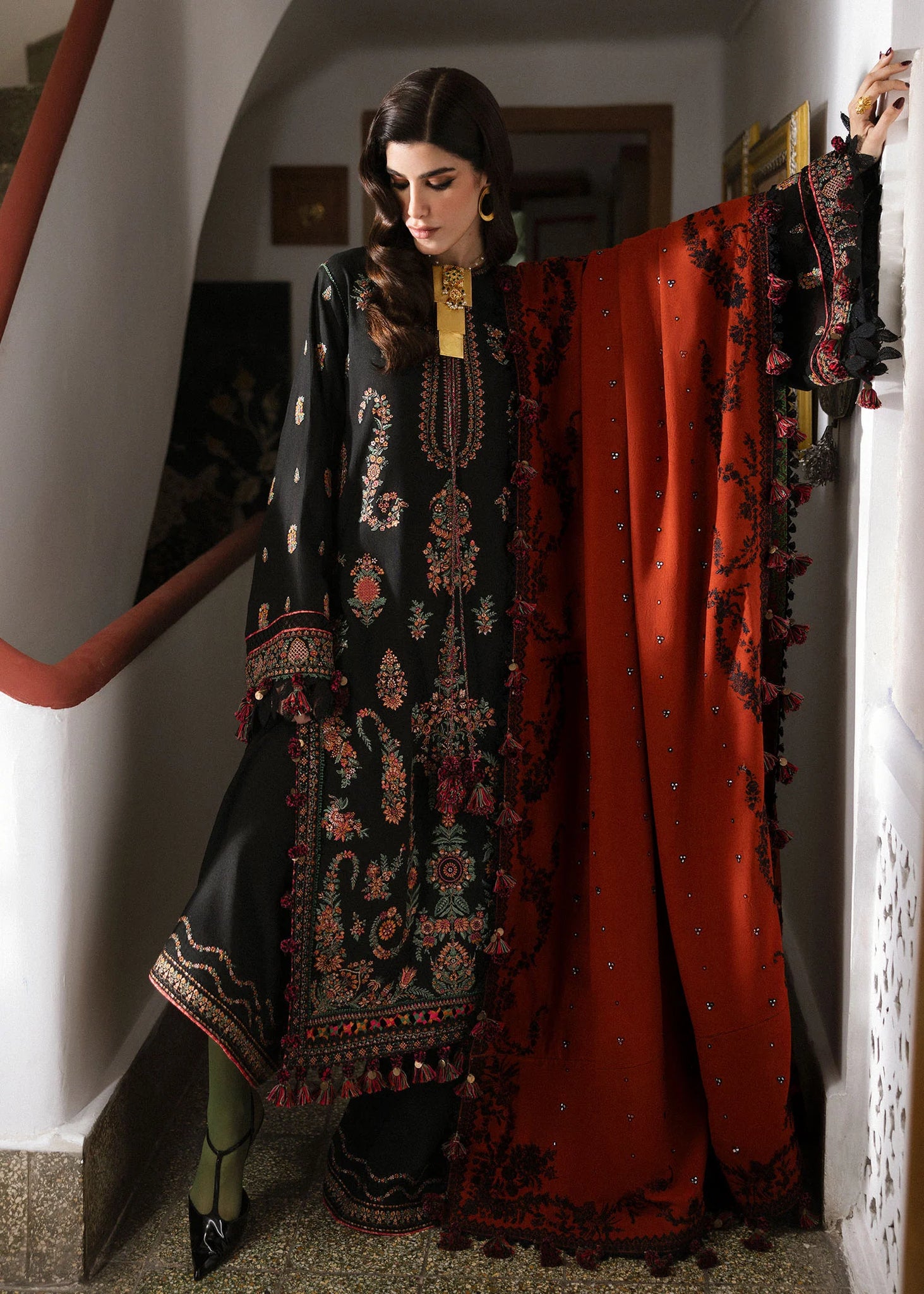 Embrace the art of elegance with this lavish karandi ensemble,where intricate embroidery and exquisite detailing come together in perfect harmony.The ensemble features a finely crafted dupatta with an extended pallu and richly adorned borders that add a touch of opulence.Every piece is thoughtfully designed,from the delicate accents on the front and back to the finely embroidered sleeves and neck borders,creating a look of pure sophistication.Paired with tastefully embroidered trouser borders,this outfit is a masterful blend of classic allure and contemporary chic.