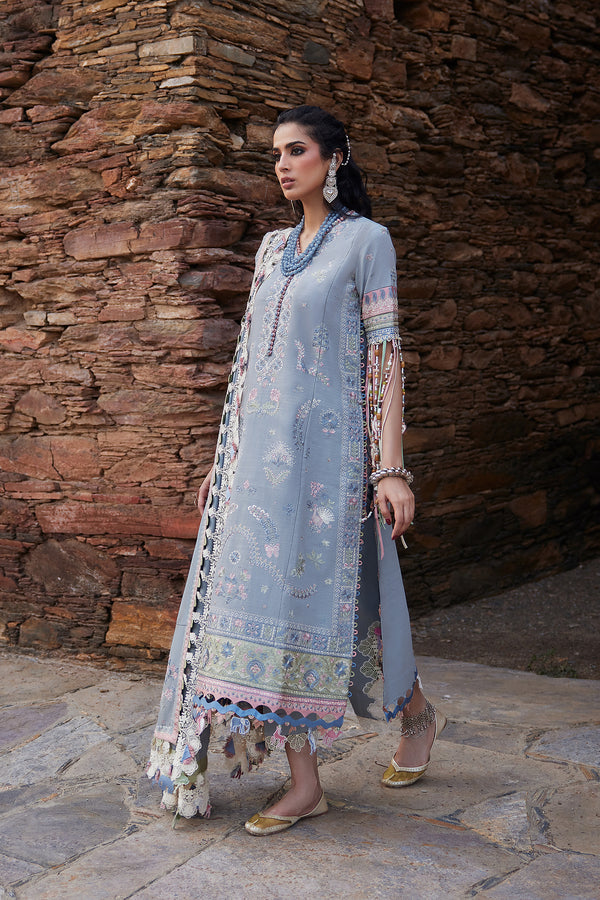Introducing "Seraphina", a captivating ensemble that evokes the enchantment of a hidden winter garden. The design unfolds against a serene sky-blue canvas, where delicate florals bloom in a soft, dreamlike haze of ivory, sage, periwinkle, mint, azure, and gentle pink. Intricate, contrasting borders delicately frame the shirt, with mint and rose pink embroideries that weave a harmonious blend of elegance and ethereal beauty.