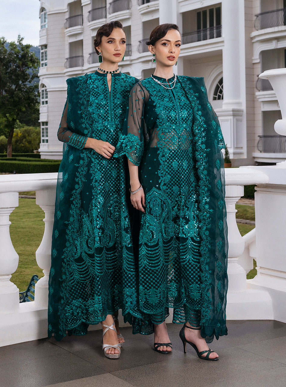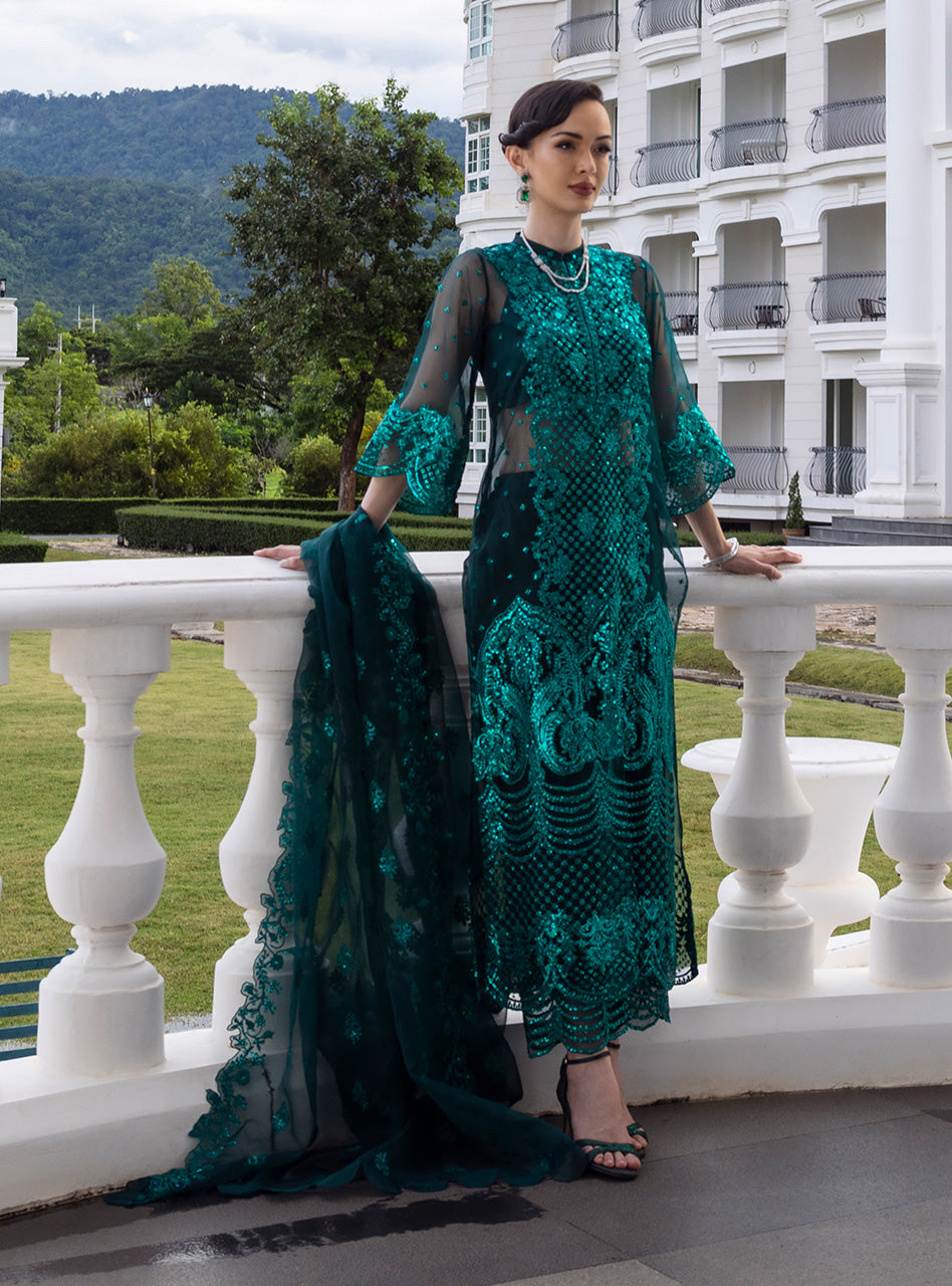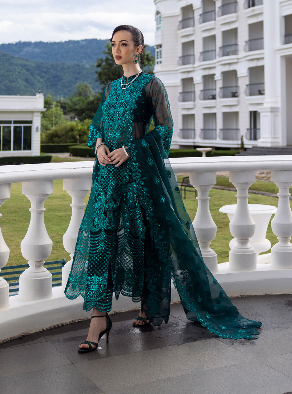 This unstitched wedding festive outfit in emerald green organza is a stunning blend of tradition and modernity. Exquisitely crafted with intricate machine embroidery and shimmering sequins, it offers a touch of luxury and sophistication. The delicate floral and geometric patterns create a captivating design, perfect for any special occasion. The luxurious organza fabric allows for customization to your desired fit and style, ensuring a personalized and glamorous look.